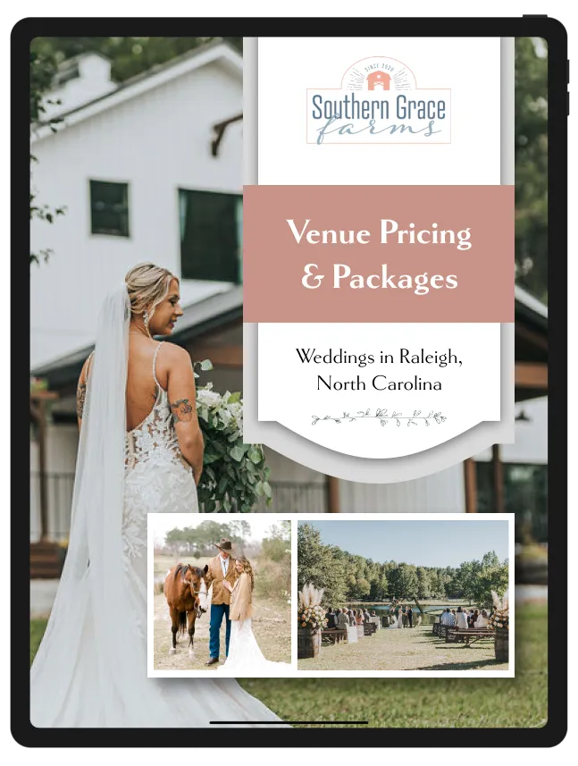 Our Pricing Pamphlet will give you a peak inside Southern Grace Farms and help you know what you can expect from our wedding experience. Learn more about our pricing, packages, amenities and much more!